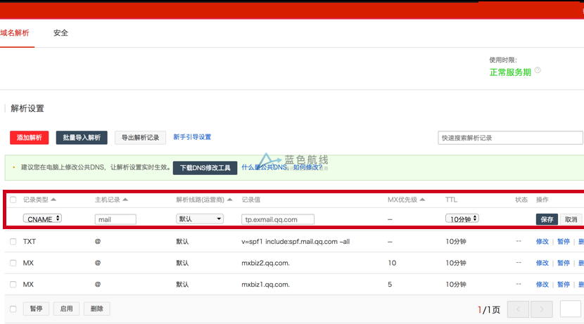 第四步:请按照如下图示填写:主机记录填写:mail;记录值填写:tp.exmail.qq.com。其他设置保持默认。